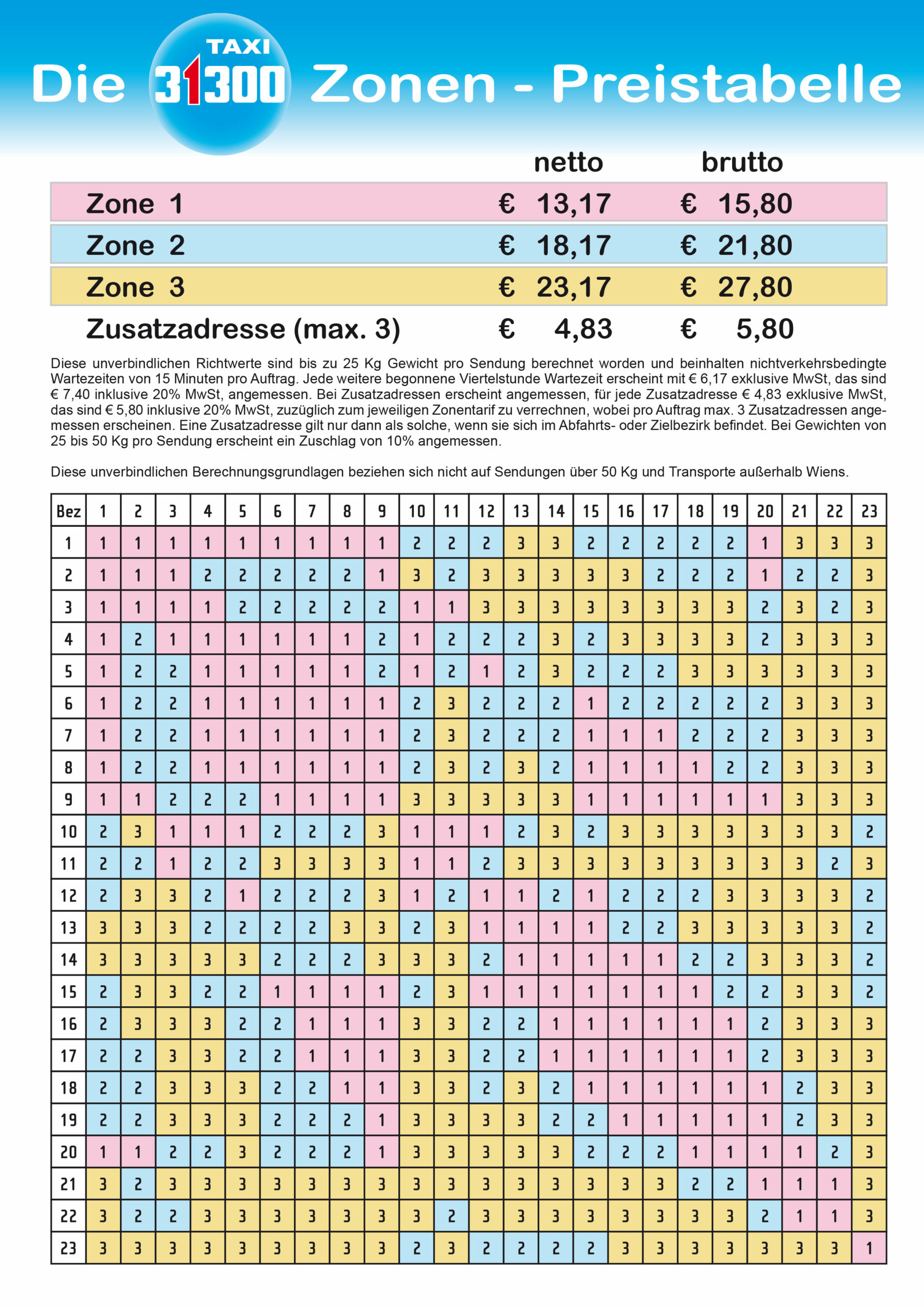 Unser Botenfahrten-Dienst ist flexibel und rasch für Sie da. Damit Sie für die gleiche Strecke immer das Gleiche bezahlen, bieten wir Ihnen unsere Leistungen zum Fixpreis an. Die unverbindlichen Richtwerte werden bis zu 25 kg Gewicht pro Sendung kalkuliert. Bei einem Gewicht bis zu 50 kg pro Lieferung verrechnen wir einen Zuschlag von 10%. Mehr darüber finden Sie in unserer Zonentarif-Übersicht.